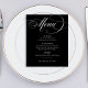 This elegant, dark black budget wedding menu card features classic, old-world style with romantic white calligraphy. Add your dinner choices for starters or appetizers, first course, main course or entrée, and desserts. Set the tone for your sophisticated Italy inspired wedding reception or rehearsal dinner, or bridal shower food offerings, with this classy, minimalist design.