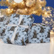 An image of a beautiful black Cocker Spaniel dog is the feature in the pattern on this all occasion gift wrapping paper. The dog sits amid a pattern of black paw prints and white bones, and is repeated on a silver blue background.