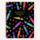 Back to school notebook personalised with the teacher's name or student's name against a pattern of colourful stars and crayons in a rainbow gradient.
