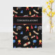 Cute black graduation card with a pattern of diplomas, black graduation caps, red and blue tassels and medals. At the top part of the pattern there is a white rectangle with red edges where the sentiment "Congratulations!" is displayed in white. Personalise the text with your own message if necessary or leave it as it is.