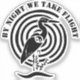 A Black Crane standing in water done in a a hybrid of silhouette and stencil style. The Crane is encompassed by a black and white spiral that focus on a a sinking ying yang design that is at the heart level, the symbol is partly sunken to represent the beginning of dusk. The hind leg is raised showing two talon, and the other leg submerge into water. Two dark plants are rising out of the water, the leaves are black. With changeable text that reads as "By Night We Take Flight"
