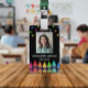 Vertical crayon teacher ID badge personalised with photo, name, grade beneath colourful stars and above a row of crayons in a rainbow gradient. Kindergarten teacher ID badge with colourful crayons and stars.