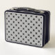 Black cross stitches on grey metal lunch box