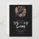 This Halloween party invitation is the perfect blend of spooky and stylish, with its black background and the words "Spooky Party" in a creepy magazine or horror cut-out font in white and purple. The font adds a sinister touch, setting the tone for a thrilling Halloween celebration. At the centre of the invitation is a black crow, surrounded by orange and grey flowers and greenery, and framed in an orange circular frame, creating a hauntingly beautiful focal point.