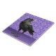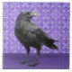 Against an intricate purple patterned background, the Black Crow stands proud, yet watchful, with his precious catch in his beak; a bright shining sphere shaped object.