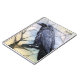 A stained glass, abstract artwork of a black crow with big spooky eyes. The crow is perched on a branch. The background is a light cream, with hint of blue gradient. Customise it with your name or initials.