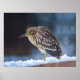 A black-crowned Night-Heron juvenile standing with one leg up in the snow. It's brown plumage with white spots on the end of the feathers. Those piercing orange bright eyes looking for food.