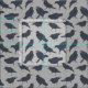 This patterned fabric is perfect for bird lovers. It features realistic style illustrations of crows in dark charcoal grey set against a speckled light grey background.