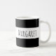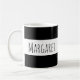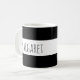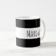 This personalised mug is designed to deliver a touch of individuality to your daily routine. The central feature of the design is a wide, customisable band that wraps around the mug, ready to be adorned with a name, rendered in a crisp, contemporary sans-serif font. The font's size makes a bold statement, ensuring the text is readable from across any room, making it a standout piece in any setting. The customisation feature on this mug makes it a perfect, thoughtful gift for friends, family, or colleagues for any occasion, be it birthdays, holidays, or professional milestones. It also serves as a charming addition to anyone's kitchenware, office desk, or as a keepsake for special events.In the spirit of personal expression, the mug is designed to be offered in a variety of colours. Regardless of the chosen hue, the design will maintain its distinct clarity and impact. The colours are selected to complement the clean lines of the text, ensuring that each personalisation stands out with elegance and simplicity. This mug is not just a drinkware item; it's a personal statement and a daily reminder of individuality and thoughtfulness. It is a blend of utility and personal expression, making it an essential item for anyone who values both practicality and a personalised touch in their daily lives.