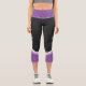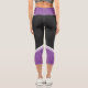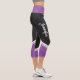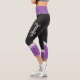 These black and purple stylish workout leggings feature an elegant white floral design on a dark lavender background on the waistband and on the legs with white stripes.