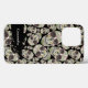 This unique phone case has a pattern made of various Day of the Dead grinning skulls. Your name is near the bottom, and everything is placed on a dramatic black background.