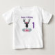A first birthday t-shirt with a black deer head with large antlers. Geometric lines inside the face of the deer adds a unique touch. Colourful pink flowers and mint green leaves form a crown on his head and floral bouquet underneath his neck. A rustic country feel. Personalise with a name and age.