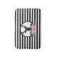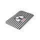 green leaves form a pretty floral bouquet below his head. A mountain range sketch placed amongst the flowers also adds to the rustic country feel. Background is a black and white striped pattern.