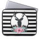 A laptop sleeve with a black deer head with large antlers. Geometric lines inside the face of the deer adds a creative touch. Colourful pink flowers and mint