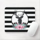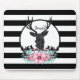 A personalised mousepad with a black deer head with large antlers. Geometric lines inside the face of the deer adds a creative touch. Colourful pink flowers and mint