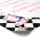 Sweet Alice in wonderland themed birthday party table top sign featuring various items from the story on a black diamond pattern background.