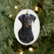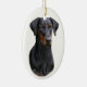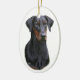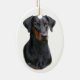 A black Dobermann Pinscher with natural ears (uncropped) on an ornament. To change the background colour click Customise>edit>background and make it suitable for the holiday or decor of your choice.