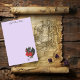 A black and green dragon sitting amongst red roses in a lavender backdrop