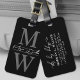 On the back, the background stays black with all text in crisp white. The phrase “This bag belongs to” appears in a script font, with your name and contact details shown in a mix of bold serif and script for a clean, stylish contrast. All colours can be customised, so you can adjust the background, initials, and text colours to suit your personal style. This custom luggage tag makes a practical and thoughtful gift for travelers—great for birthdays, holidays, or just because.