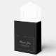 This elegant black favour box will make your guests feel special. Your white script Thank You and message is accented by a classic gold and white floral bouquet with a gold frame. The back features the couple's name with the same frame and floral accent.