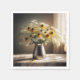 A metal pitcher holding a bouquet of Black-eyed Susan and Queen Anne's Lace flowers is placed on a lace-covered table with sunlight streaming through a window adorned with lace curtains.