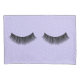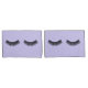 Pair of black eyelashes on white pin dots and a pastel purple background.