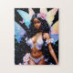 This jigsaw puzzle features a fantasy portrait painting of a pretty, dark brown-skinned fairy with very long, wavy hair wearing a purple outfit in a magical night forest with butterflies and flowers. A colorful, hyper-feminine floral artwork of an ethereal melanin-rich beauty with butterfly wings.