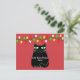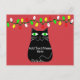 Black fat cartoon cat with green eyes. Cute cat character. Custom postcards for Christmas. Red background. Edit text to customise. Gift idea for cat lovers.