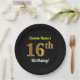 Black, Faux Gold 16th Birthday + Custom Name Paper Plate