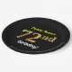 This simple, customisable, birthday-themed paper plate design features a customisable message like "Custom-Name’s 72nd Birthday!", where the name can be changed, and with the "72nd" having a faux/imitation gold-like appearance. It also features a black coloured background. Paper plates like these could perhaps be used at a party being held to celebrate somebody’s seventy second birthday. [~Z0000143]