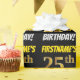 This wrapping paper design features a message like "FIRSTNAME’S 25th BIRTHDAY!", with the "25th" having a faux/imitation gold-like colour appearance, and with the name and "BIRTHDAY" in a fun, bold font. The name can be customised, and the background is coloured black. Wrapping paper like this could perhaps be used when wrapping birthday gifts being given to somebody in celebration of their twenty fifth birthday. [~Z0000203]