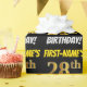 This wrapping paper design features a message like "FIRST-NAME’S 28th BIRTHDAY!", with the "28th" having a faux/imitation gold-like colour appearance, and with the name and "BIRTHDAY" in a fun, bold font. The name is customisable, and the background is coloured black. Wrapping paper like this could perhaps be used when wrapping birthday gifts being given to somebody in celebration of their twenty eighth birthday. [~Z0000203]