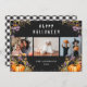 Beautiful black and white buffalo plaid photo collage Halloween cards featuring pumpkins and purple flowers on the front and a black and white buffalo plaid pattern at the back. Easily personalise these 3 photo Halloween cards with your photos, the family name and the year or other text.