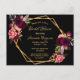 On front: A stylish black background with a faux gold geometric shaped frame. Decorated with dark burgundy and pink flowers, roses and boho style feathers. Templates for the name of the bride and party details. The name is written with a hand lettered style script, golden coloured letters.