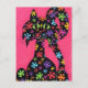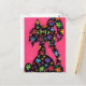 This friendly black cat sits against a vivid pink background, showing off her detailed multicolored flower-shaped markings in this uplifting design.