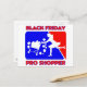 Professional sports red & blue symbol of a white silhouette of a woman frantically running with a loaded shopping cart, with products flying everywhere. Phrase, “Black Friday Pro Shopper” written below in fun block red lettering with blue outline.