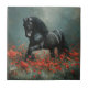 A black Friesian stallion standing gracefully among vibrant red poppies, ideal for horse enthusiasts, lovers of bold floral contrasts, and anyone who appreciates the elegance of equine beauty in dramatic natural settings.