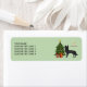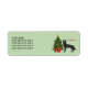 Destei's original cartoon illustration of an adorable black colour German Shepherd breed dog. The dog is standing by a festive Christmas tree decorated with red and yellow ornaments, a white pearl garland and a yellow star that is placed on the top of the tree. There are also two wrapped presents by the tree and behind the dog there is a brown shelf with two candles. The background colour is light green. Next to the design there is a personalizable text area.