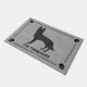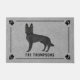 Destei's original cartoon illustration of a black colour German Shepherd breed dog. The background colour is grey with a decorative texture. The texture can be removed and the background colour can be changed to any other colour, if so wished. The design is framed by a stylish border. There is a dog paw print silhouette in each corner as well. Under the dog image there is a personalizable text are for a family name or other custom text such as "welcome", for example.