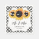 Personalised black and white gingham and sunflower wedding paper napkins featuring sunflowers on a gingham background adorned with string lights. Matching items available.