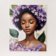 This floral artwork features an oil painting portrait of a beautiful black girl with short afro curly hair adorned by and surrounded by small purple flowers. The brown-skinned beauty is facing forward with eyes closed, looking serene. A feminine, melanin-rich young adult botanical portrait.