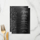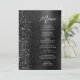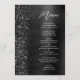 This elegant modern wedding menu features a faux diamond glitter border on a black faux brushed metal background. The customizable text combines white handwriting script and sans serif fonts. The black brushed metal and glitter design is repeated on the reverse side.