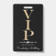 This custom VIP all access pass badge features a glamourous and elegant theme on a black background. The VIP title is printed in a gold glitter design on the left. A band of diamonds separates the text area. A sample event and same are printed below. The event or party information is printed on the back.