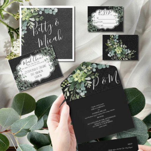 Black Glitter and Floral Eucalyptus Bouquet Meal Enclosure Card