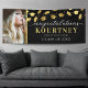 Modern graduation party banner featuring a stylish black background that can be changed to any color, a photo of the graduate, falling faux gold foil mortarboard caps, and a modern text template that is easy to personalize.