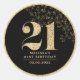 Personalised black and gold 21st birthday round party favour label for with simple patterns, simulated glitter and script handwriting font. Customised with name, birth year/birth date, or short messages of your own.