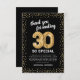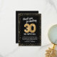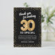 Elegant thirtieth birthday party thank you cards featuring a stylish black background that can be changed to any colour, gold sparkly glitter, thirty gold hellium balloons, and a modern thank you template that is easy to personalise.