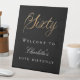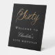 A welcome sign for a 60th birthday party. Black background. Sixty written with large golden hand lettered style script. Personalise and add a name.