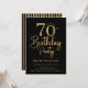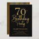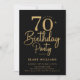Black gold 70th birthday party invitation. Trendy modern design, perfect for a stylish men's or women's bday celebration. Features script font and confetti. Customize with your own details. Printed Zazzle invitations or instant download digital printable template.