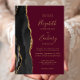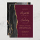 The left-hand edge of this elegant modern wedding invitation features a black watercolor agate border trimmed with faux gold glitter. The customisable text combines gold-coloured handwriting, copperplate and italic fonts on a burgundy red background. The reverse side features a matching black and gold agate design.